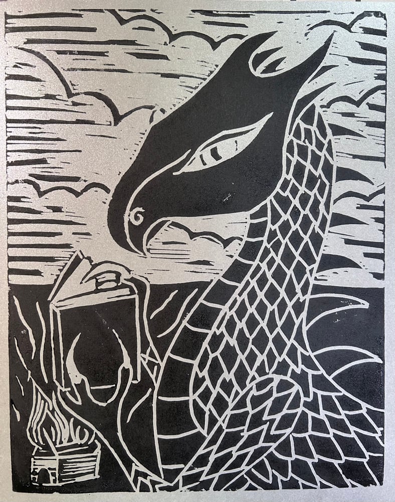 linocut print on silver shimmer. 8x10 print on 8.5x11 paper
